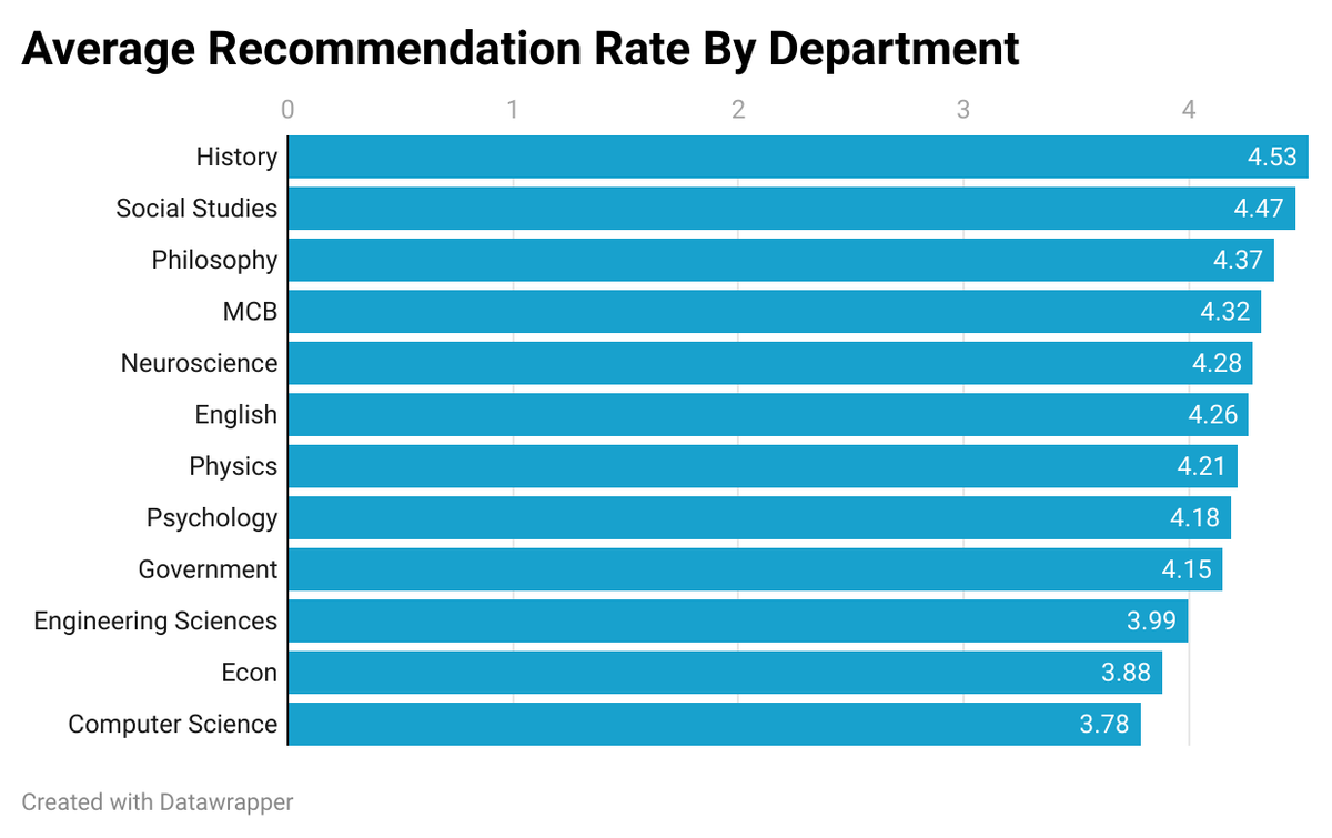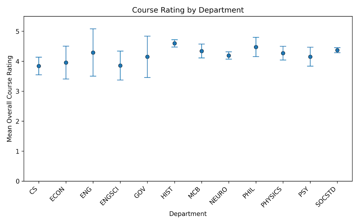 Figure 1.The above plot shows the average recommendation rate, compiled the mean recommendation rate of each course, and averaged it across all the courses chosen for the department. We can see that the core courses (namely HIST 1333 - Hegel and Marx, HIST 1465 - The United States and World Order Since 1900, HIST 1301 - Western Intellectual History: The Prehistory of Modern Thought, HIST 1045 - The First World War, HIST 1125: Reasoning from the Past: Applied History and Decision Making) from the History department have the highest average recommendation rate of 4.53, while core courses (COMPSCI 61 - Systems Programming and Machine Organization, COMPSCI 1240 - Data Structures and Algorithms, COMPSCI 1200 - Introduction to Algorithms and their Limitations, COMPSCI 171 - Visualization, COMPSCI 1820 - Planning and Learning Methods in AI) from the Computer Science department have the lower average recommendation rate of 3.78. There is no apparent correlation between the recommendation rate of humanities and liberal arts courses compared to that of STEM courses—both MCB and Neuroscience have relatively high rates of recommendation, while History has a comparatively low rate of recommendation.