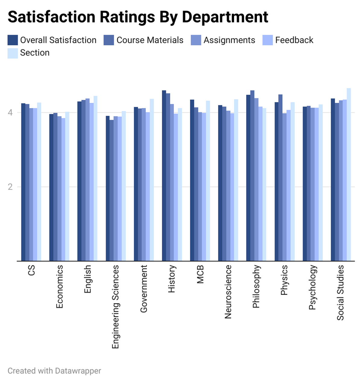 Now we can dive a little bit deeper into students' evaluations of the overall course, as well as the defining feature of most Harvard courses–the work done outside of actual class within these departments.