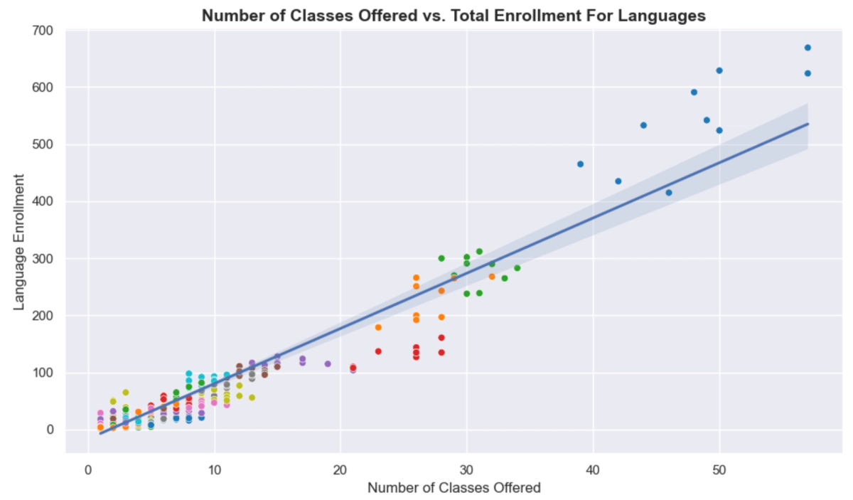 Figure 5: Every language’s courses offered per semester against its total enrollment (also per semester). Different colors denote different languages.When plotted using a least-squares regression model, the number of classes offered by a language seems to explain 92% of the variation in total enrollment, with the main outlier being Harvard’s most popular language, Spanish (the blue data points in the top right of the graph). In particular, the data suggests that Spanish has much larger class sizes than other languages. By the clustering of points on the left side of the graph, we can also see that the vast majority of languages offer less than 15 courses per semester and have below 100 enrollees, with only four different languages (Spanish, French, Chinese, and German) consistently offering more than 20 courses a semester.