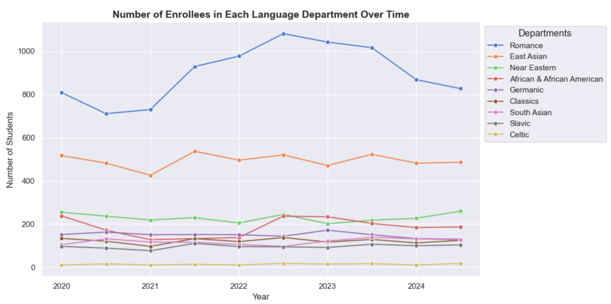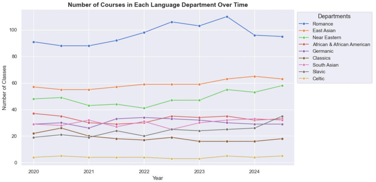 Overall, the number of language courses in each of the nine departments has remained relatively constant, with the three largest departments (Romance, East Asian, and Near Eastern) and the Slavic language department showing increases on the whole over the past ten semesters. The only department with a decreased number of language courses on the whole is Classics, with Greek and Modern Greek decreasing in course options and Medieval Greek disappearing altogether after 2022. Even as the number of enrollees fluctuated greatly, the number of classes offered was generally more stable, with the South Asian Studies department even increasing their course offerings as total enrollment across languages dropped by 350 people between fall 2020 and spring 2021. When language enrollment rebounded the following semester, it was the two largest departments by enrollment (Romance and East Asian Languages) that saw the largest percent increases.