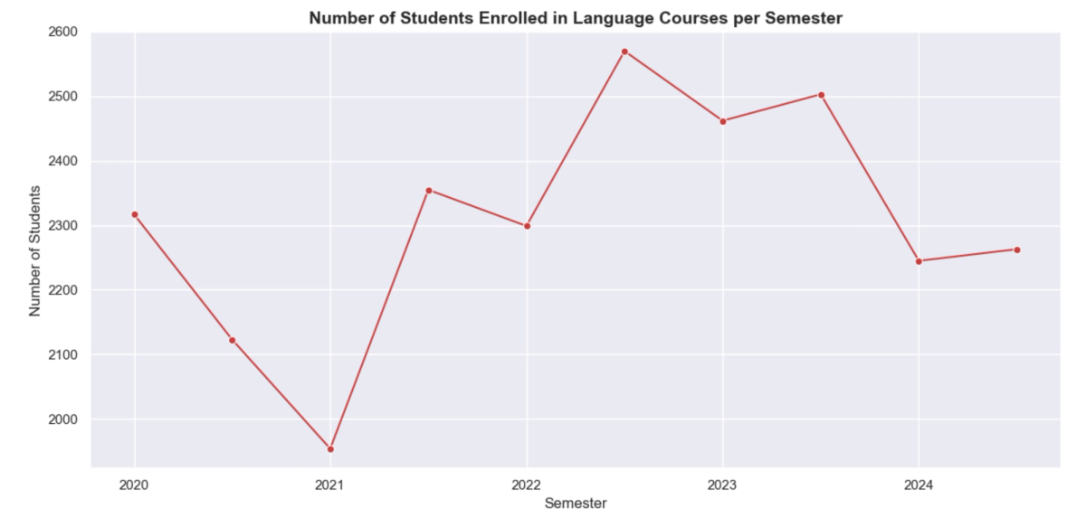 Our data was taken from the Harvard FAS Registrar’s Enrollment Reports across the past ten semesters (Spring 2020-Fall 2024), which we cleaned and combined into one large dataset with just courses teaching languages. Since the pandemic, 235 professors have taught 3,445 language classes for 87 unique languages. On average, 2,300 students took a language course each semester, with that number peaking at 2,575 in the fall of 2022. In the spring of 2021, however, only 1,956 students took a foreign language, a number far lower than any other semester.