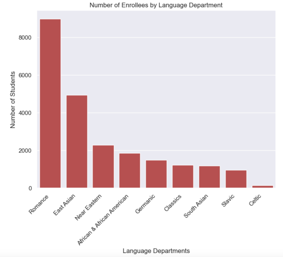 Figure 1: Number of students enrolled in a language course, broken down by semester. The early stages of the pandemic saw a drastic decline in the number of students taking language courses, but this quickly rebounded after Harvard classes came back in-person.At Harvard, nine departments currently offer language courses, these being: African & African American Studies, Celtic Languages & Literatures, Classics, East Asian Languages & Civilizations, Germanic Languages & Literature, Near Eastern Languages & Civilizations, Romance Languages & Literature, Slavic Languages & Literatures, and South Asian Studies. The Romance Languages department is easily the largest, having around 80% more enrollees than the next largest department (East Asian Languages) and 60 times more than Celtic Languages, Harvard’s smallest language-offering department.