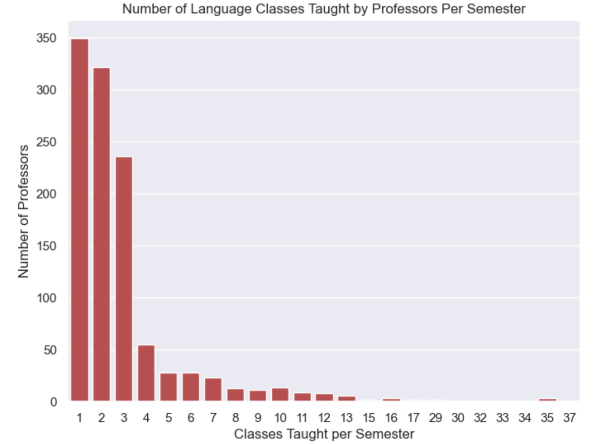 Figure 6: How many professors teach a certain number of courses per semester (these could be the same course taught in multiple classes or two courses from completely different languages).
